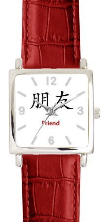 WatchBuddy Watches are the World's Most Lovable and Finest Theme Watches, they combine beauty, style and grace with functionality. This Deluxe Silver Tone Square Case Watch has a Square Silver Tone metal case, a stainless steel case back (laser engraved) and a genuine leather strap.The watch has a precision quartz crystal three hands movements - hour, minute and second. The watch is shower proof. Battery life is 2 years. Watches have a one year limited warranty. Watches come in two sizes - Large Size: for standard men's or jumbo women's size and Small Size: for standard women's or children's size. The watch comes packaged in a high density plastic capsule with the warranty information. Each WatchBuddy Watch is carefully designed & crafted and then graced with an image of world class fine art (paintings & drawings); fine photographic art; charming, endearing or humorous realistic art or whimsical cartoon art; or iconic designs & symbols. Our vast library of images encompasses almost every theme and subject imaginable! These watches are a unique and perfect gift idea or present for all occasions such as a Birthday, Anniversary, Mother's Day, Father's Day, Valentine's Day, Graduation, Bar Mitzvah, Bat Mitzvah, Christmas or Hanukkah..../ Friend - Chinese Symbol - WATCHBUDDY® DELUXE SILVER TONE SQUARE CASE WATCH - Red Strap - Large Size (Men's or Jumbo Women's Size) / Silver Dresses